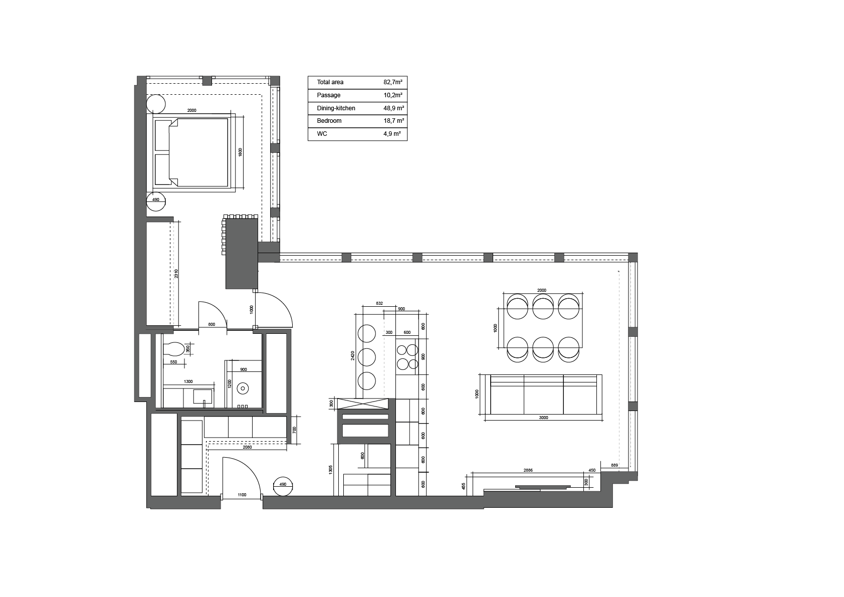 The room visualization was created based on technical drawings and existing concepts. Total area of the apartment is 83 square meters.